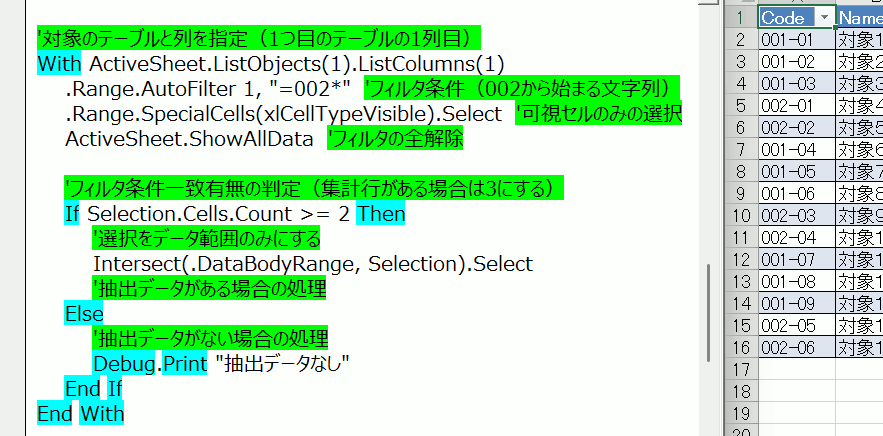 このコードを使用すると、テーブル機能でフィルタをかけていない状態でも、フィルタを適用した際に抽出されたデータのみを選択状態にすることができます。
